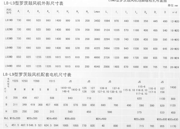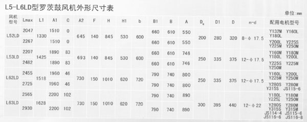 L系列羅茨鼓風(fēng)機(jī)性能參數(shù)表