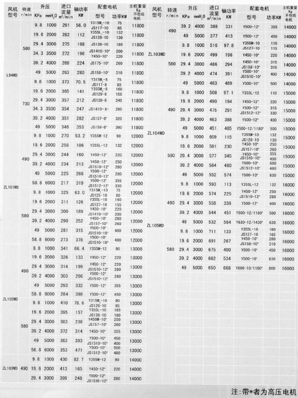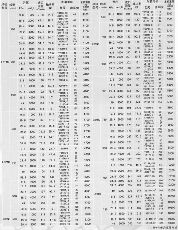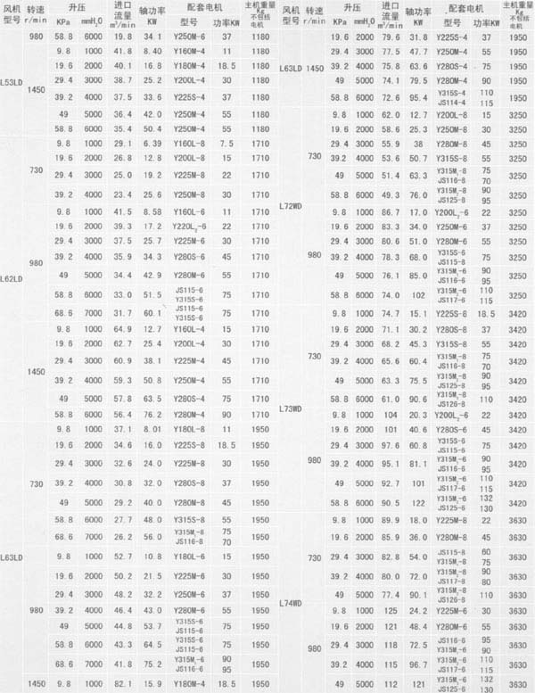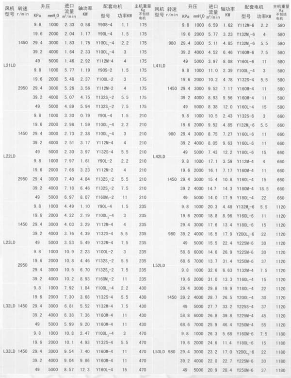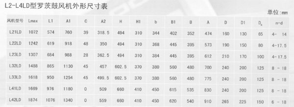 L系列羅茨鼓風機性能參數表