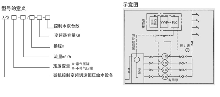 該設備由水泵機組、電控系統、壓力儀表、閥門管路及共同底座等組成。其中電控系統由變頻調速器,可編程序控制器、壓力設定器(專用PID)及低壓電器線路等組成。(見示意圖)